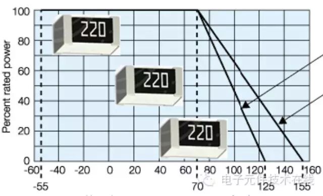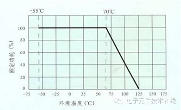 厚膜电阻器的额定功率通常定义在环境温度70℃下,当高于70℃时,应参照斜率按对应温度降额使用,见图A。